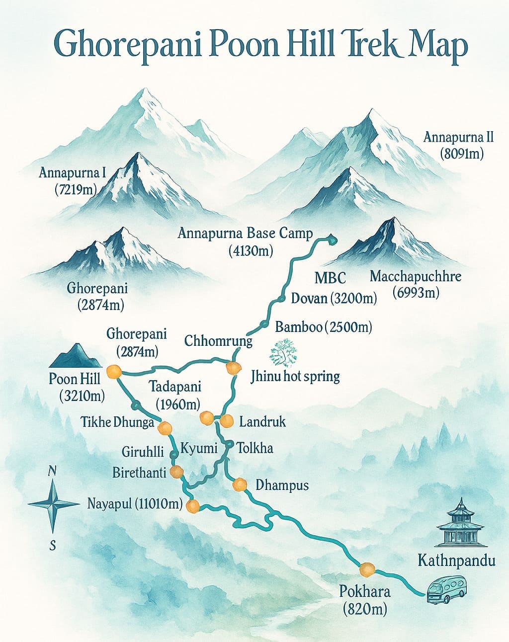 Annapurna base camp, but if you are not willing to do the ABC trek, then you can just reach Ghorepani, witness the sunrise and sunset, and then return to Pokhara. The Poon Hill viewpoint lies at an altitude of 3210 meters above sea level, which is a 1-hour hike from Ghorepani. You will need to ascend the hills and then witness the beautiful angles on the Annapurna I, Annapurna II, Annapurna South, and Dhaulagiri ranges at a distance.